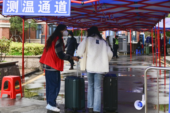 志愿者身穿的“红马甲”,依然是校园里最靓丽的风景。志愿者们协助教职员工进行测温、扫码等工作,帮助同学们搬运行李,体现了新华学子的奉献与担当。