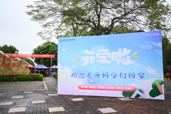 学校还在校门口、校道旁设置了暖心展板和横幅,欢迎同学们“回家”,叮嘱同学们做好防疫工作。