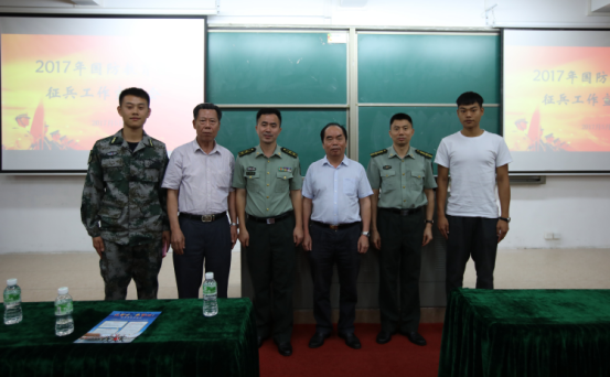 为扎实做好太阳成集团122ccvip2017年度大学生征兵安排工作,营造大学生积极报名太阳成集团122ccvip、携笔从戎的良好氛围,2017年天河区国防教育暨征兵工作宣讲会于5月24日下午在太阳成集团122ccvip东莞校区举行。太阳成集团122ccvip副校长、副书记蓝永金,保卫处副处长罗立和及广州市天河区人民武装部副部长覃德兴中校出席。