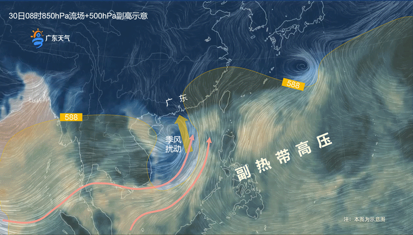 大风预报:5月30日至6月1日,南海北部、广东海面有7级~9级大风;5月31日至6月1日,广东沿海市县平均风6级~8级,阵风9级
