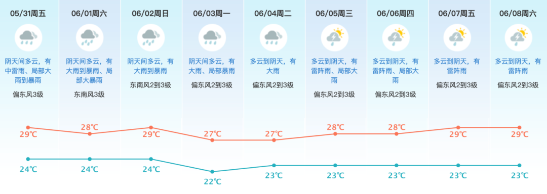 6月2日,粤东市县多云到阴天,中到大雨转阵雨;其余市县多云,有阵雨。